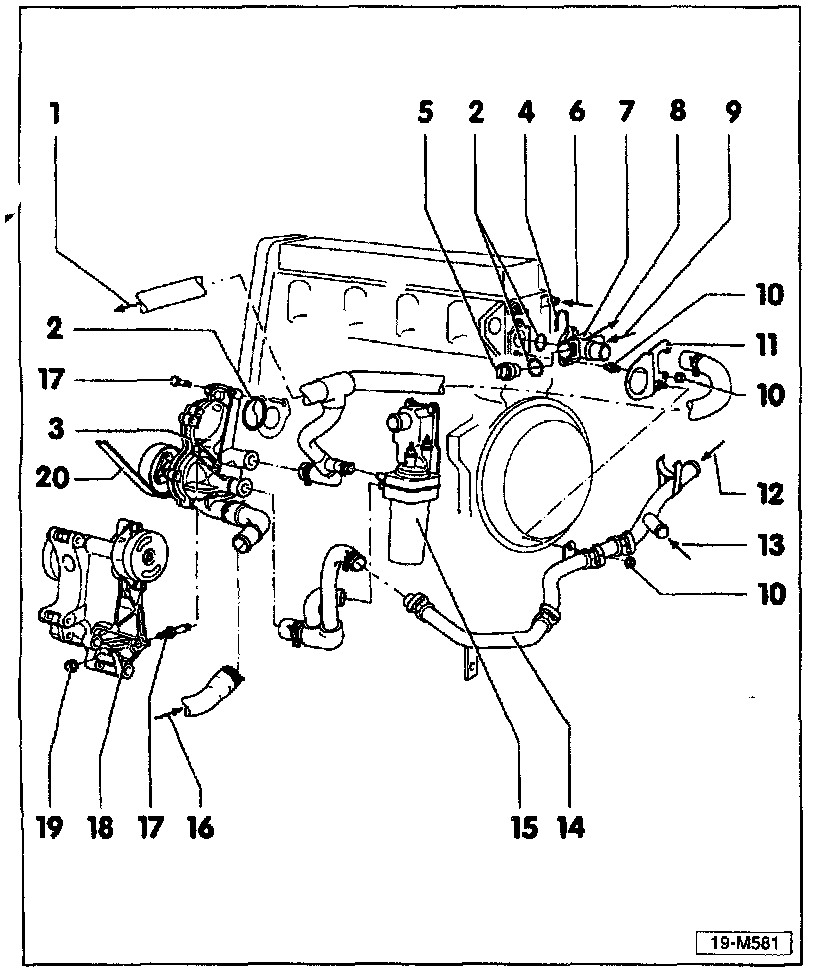 13. From expansion tank (manual trans.) or ATF cooler (automatic trans.)