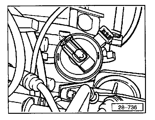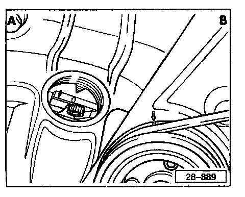- Align mark on vibration damper (pulley) with arrow on top of poly-ribbed belt guard.
