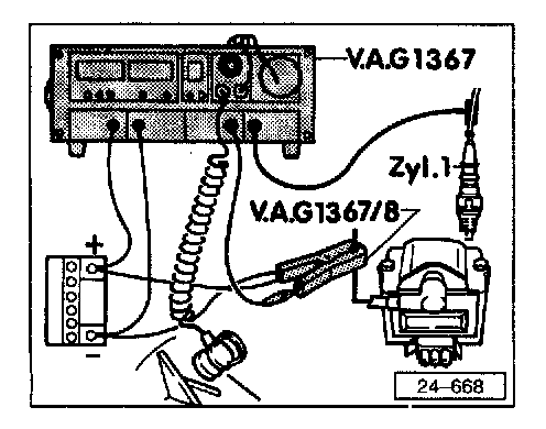 - Connect VAG 1367 ignition tester using VAG 1367/8 inductive pickup adapter.