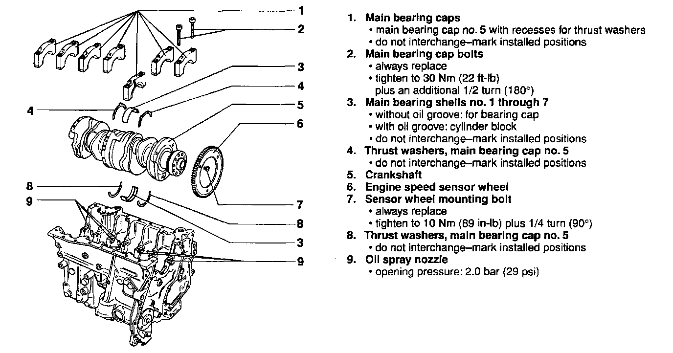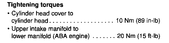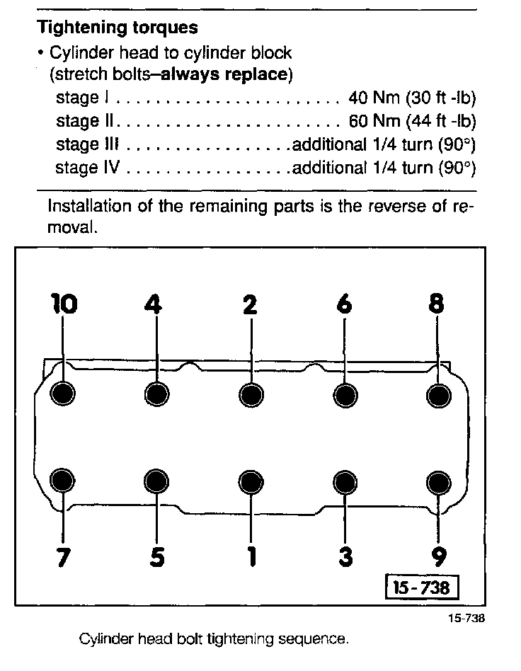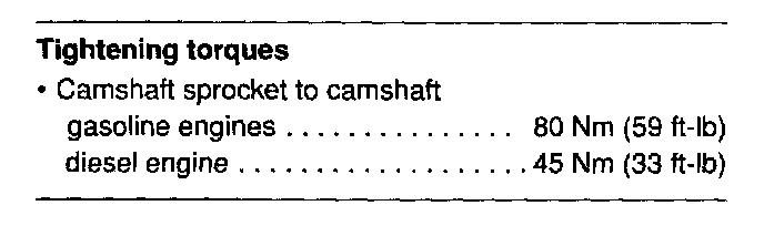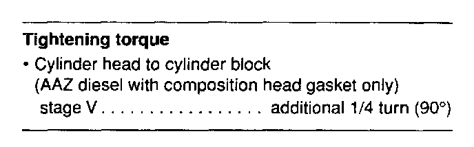 Torque SpecificationsEngine And Transmission Codes:Crankshaft Torque Specifications:Four Cylinder EnginesSpark Plug To Cylinder Head Torque Specifications:Diesel Injectors Torque Specifications:Diesel Glow Plug To Cylinder Head Torque Specifications:Cylinder Head Cover And Upper Intake Manifold Torque Specs:Camshaft Sprocket To Camshaft Torque Specifications:Camshaft Bearing Cap Torque Specifications:Cylinder Head Torque Specifications:Cylinder Head Torque Sequence (AAZ Diesel Engine Only):