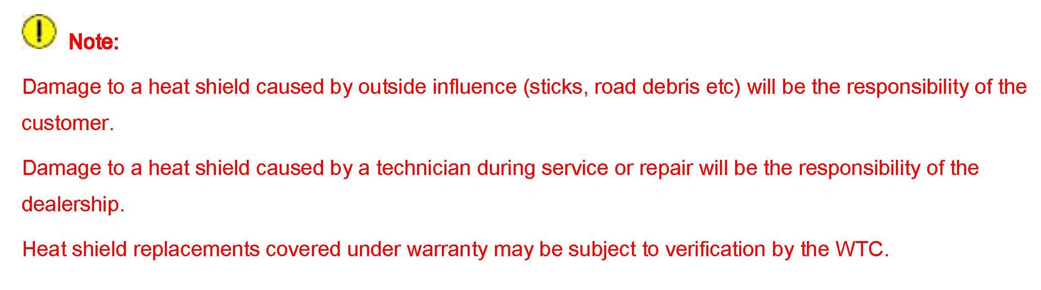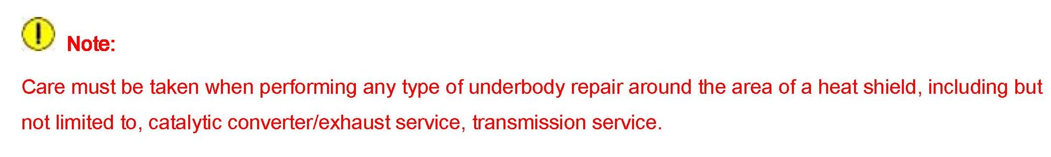 Underbody heat shields are important for proper vehicle performance. Heat Shields are to be inspected after completion of any type of repair to the underbody (exhaust system, transmission, etc.), and if damaged, replaced