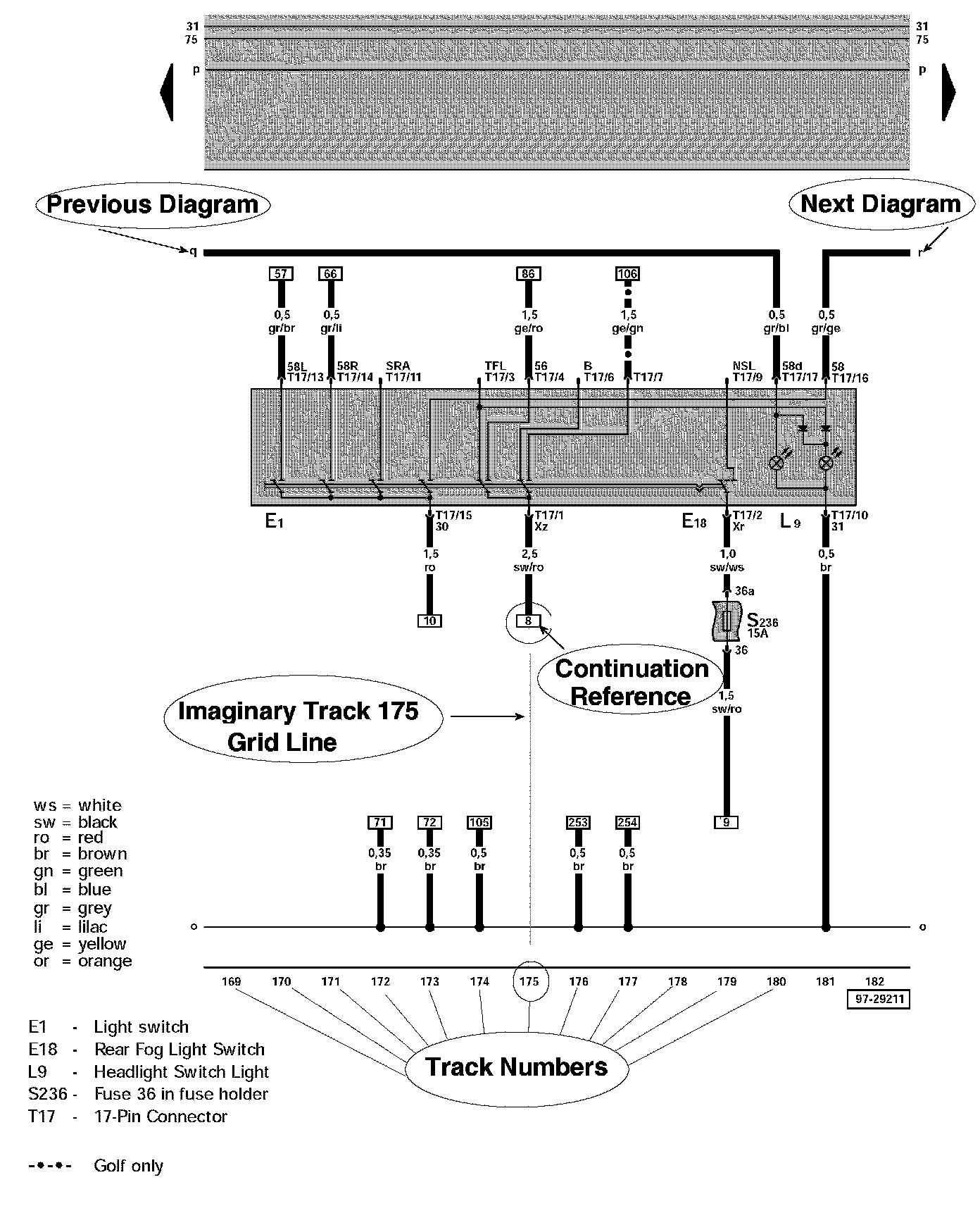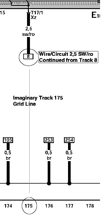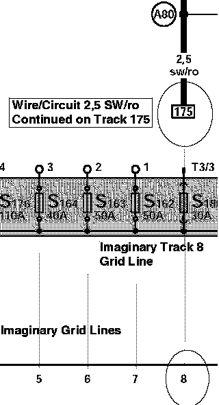 However, wires/circuits traveling the diagram in a vertical direction are following the tracks, and when they enter/leave a diagram they could be skipping numerous diagrams in the series before picking up again on the destination diagram. When these wires/circuits enter or leave a diagram, the track number of the diagram they came from/go to will be shown within a continuation reference frame/box.