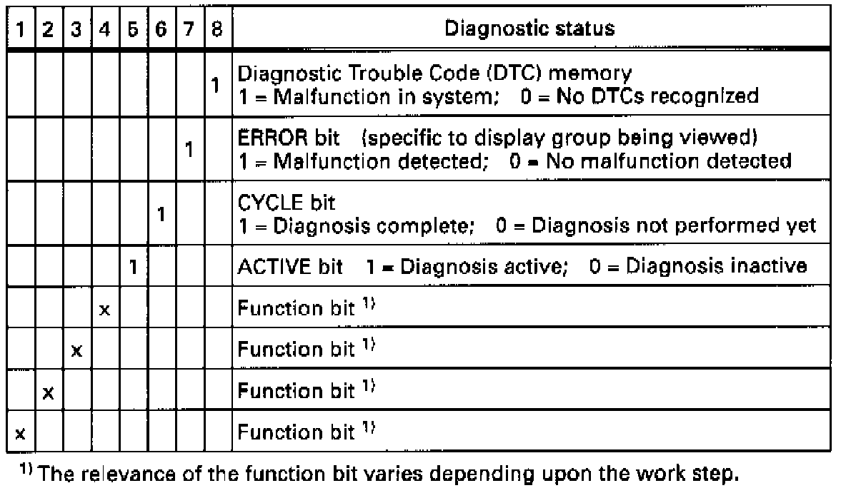 - An "x" in the diagnostic status table specification means the display can be either 0 or 1.