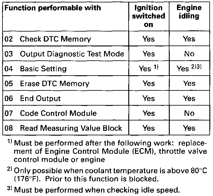 NOTE: The ECM is equipped with various functions, Some functions can be carried out with ignition switched on or with engine running. The following table details the prerequisites for carrying out the individual functions.