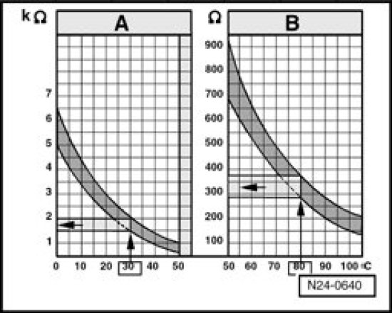 80°C is in range B and corresponds to a resistance of 275 to 375 ohms