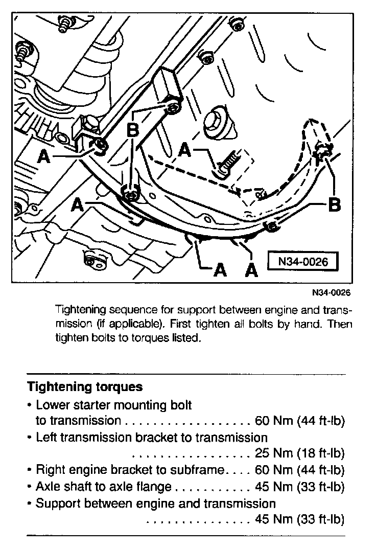 When reinstalling the engine to transmission support, tighten the support bolts in the specified sequence shown in image above.