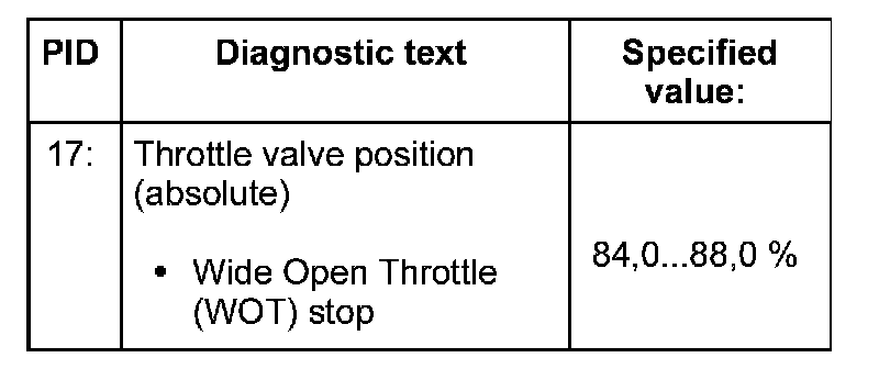 - Check specified value of throttle valve position (absolute) at Wide Open Throttle (WOT) stop: