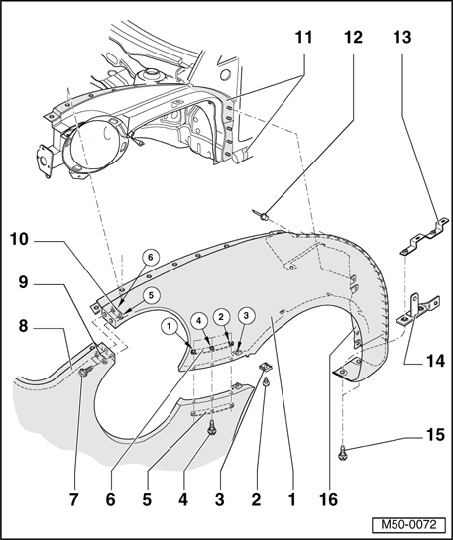 - Overview describes removal and installation of front fender for vehicles --> 06.05. Removal and installation applies to vehicles 07.05 -->, except slight changes.