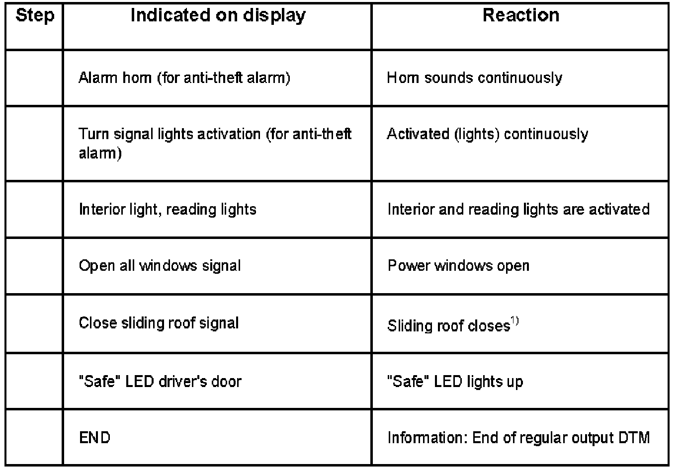 The components displayed in output Diagnostic Test Mode (DTM) can differ depending upon the equipment installed on the vehicle. For example, on vehicles without ATA there will be no "step 1" as listed in the table below.