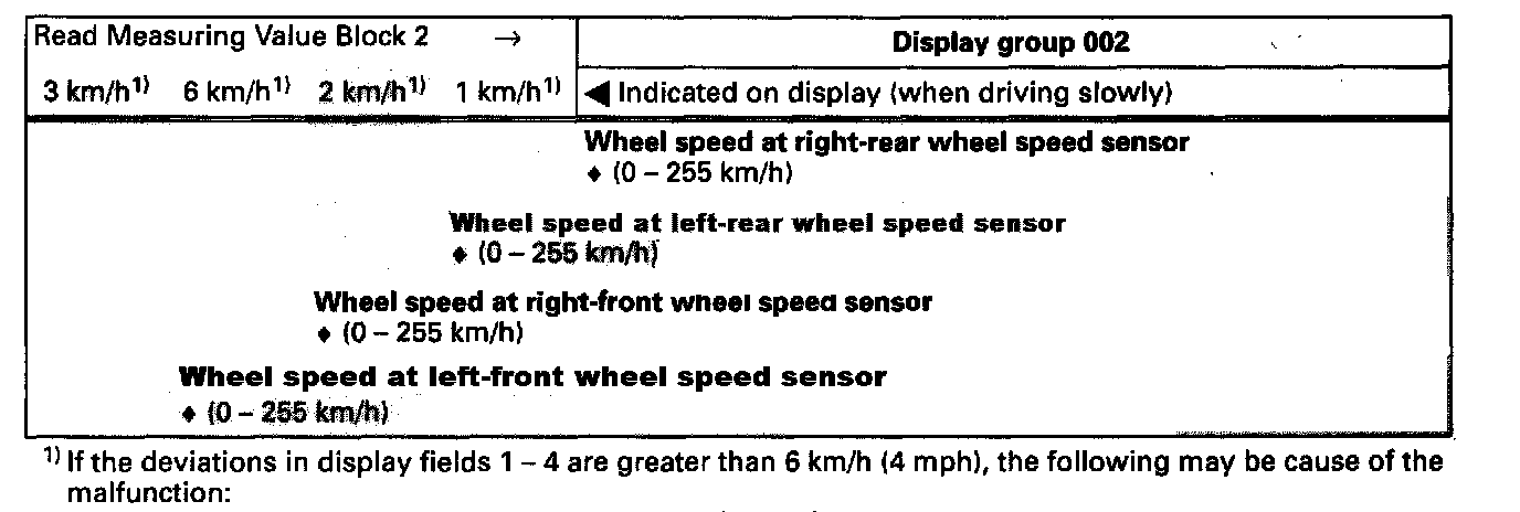 The measured value block for display group 002 must be read when the vehicle is being driven slowly. ABS control module -J104- saves the first usable voltage signal from the wheel speed sensor and displays this value in the display group. The values are displayed on the VAG 1551 when the vehicle is being driven slowly.