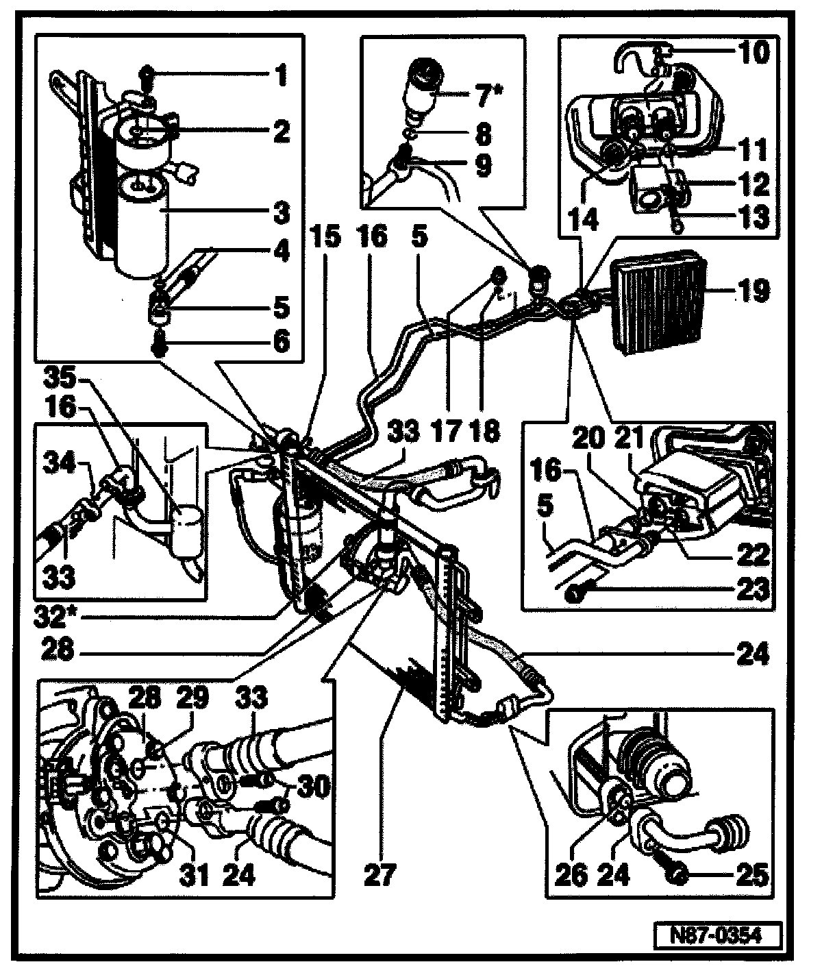 - Except where indicated with *, all system components illustrated must only be serviced or replaced after discharging refrigerant system.