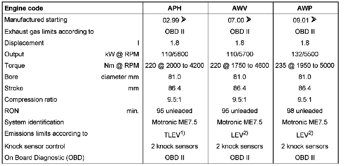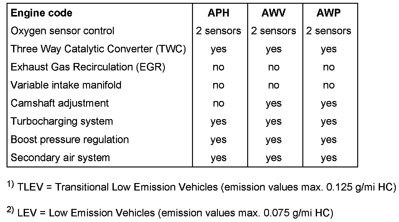 1) TLEV = Transitional Low Emission Vehicles (emission values max. 0 125 g/mi HC)