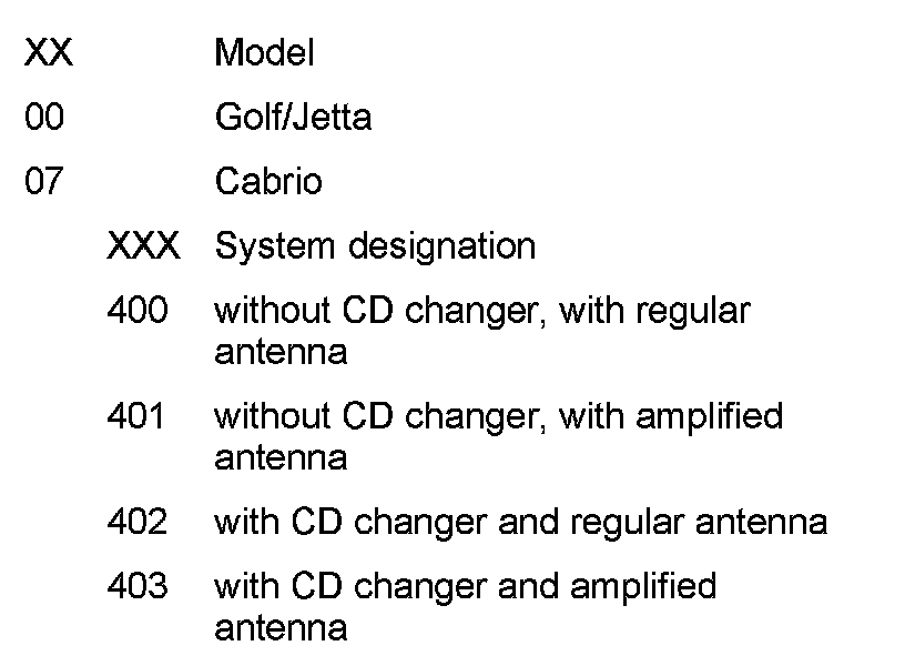 Coding example: 00400 = Golf/Jetta without CD changer, with regular antenna (no GTI/GLX).