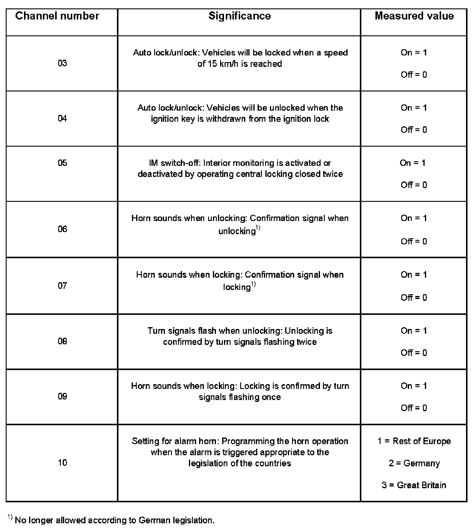 - Press keys 0 and 8 (channel number 08 switches the turn signals on or off when unlocking).
