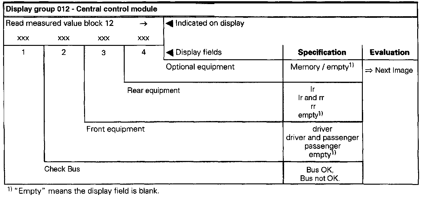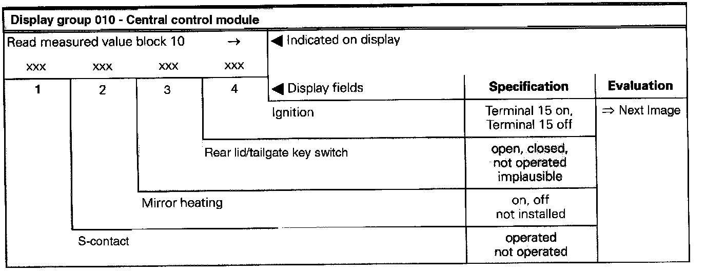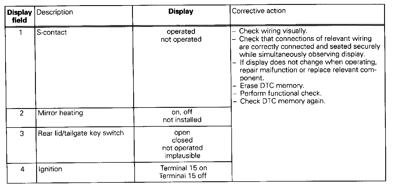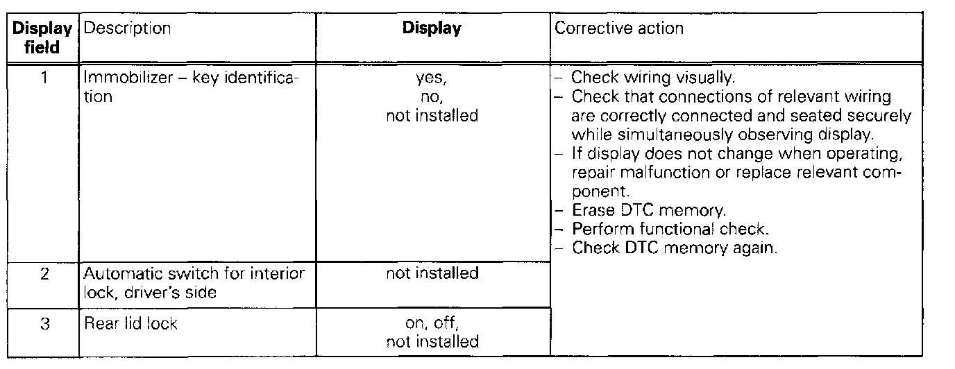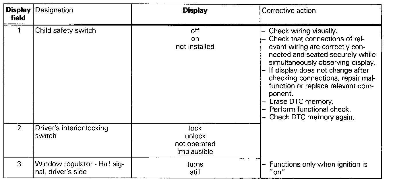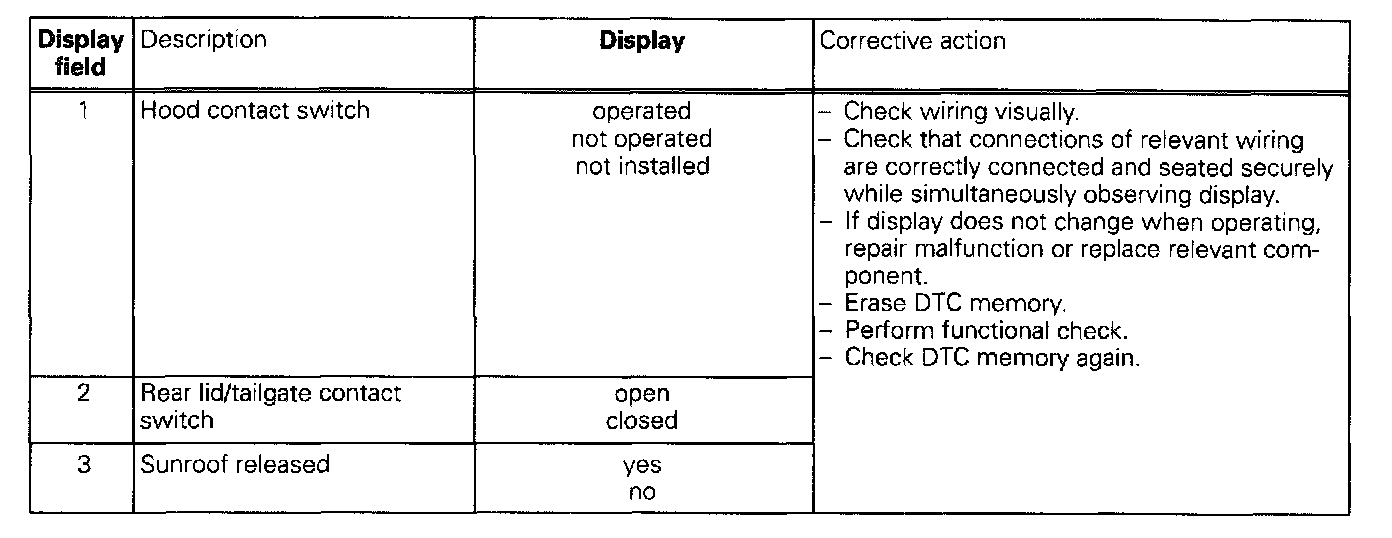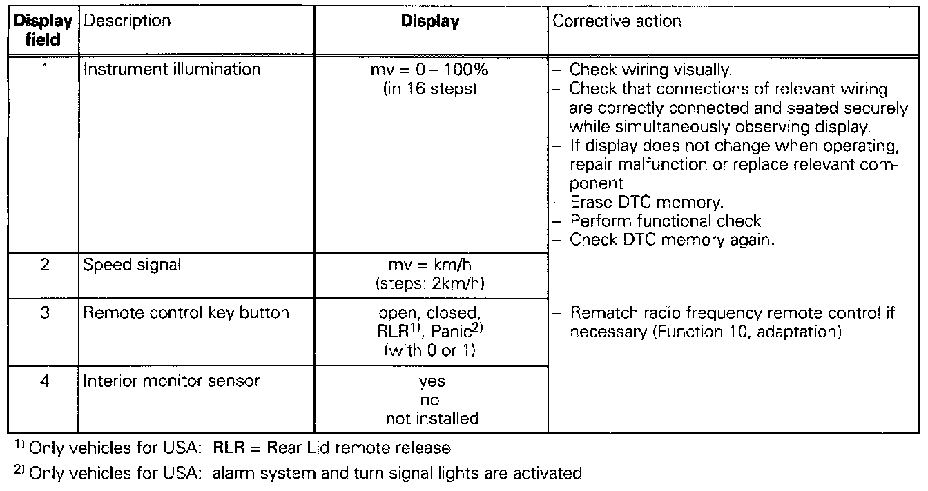 The measured values in "measured value block" and "basic setting" are described during the individual component test. This table serves only as an overview.