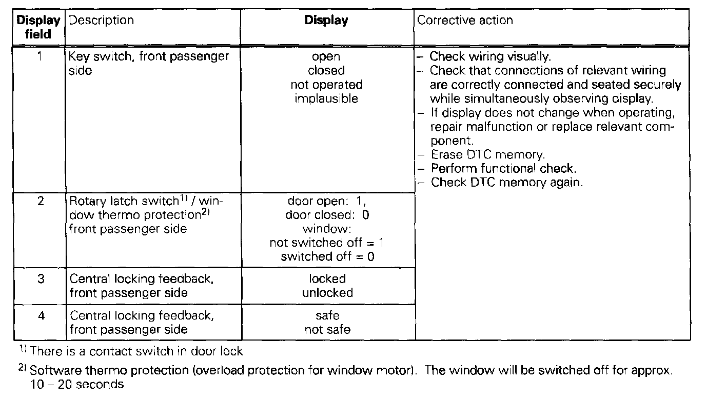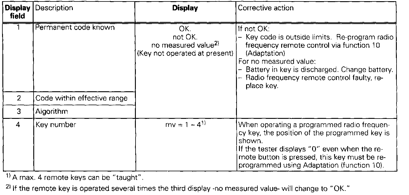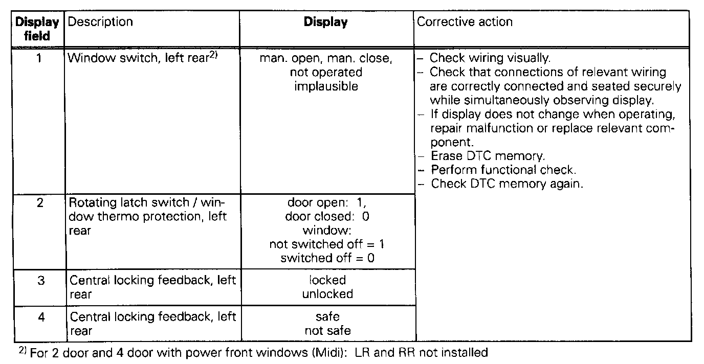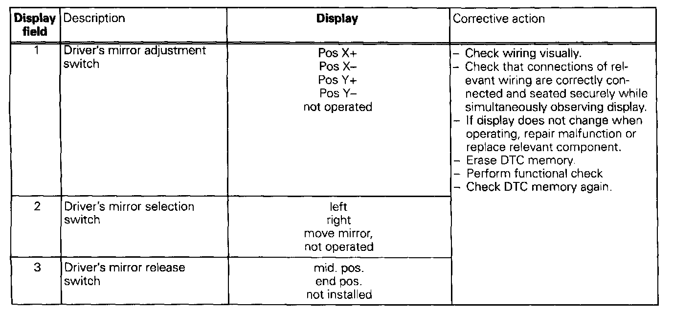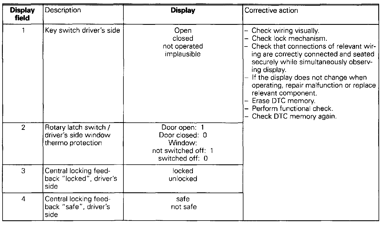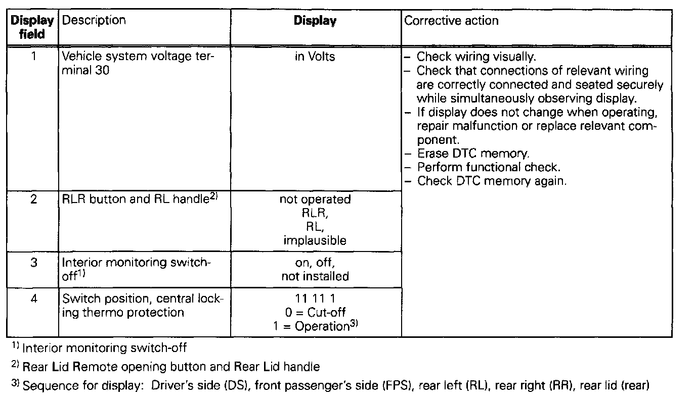 The measured values in "measured value block" and "basic setting" are described during the individual component test. This table serves only as an overview.
