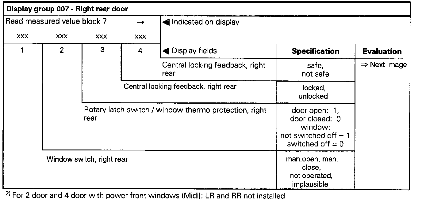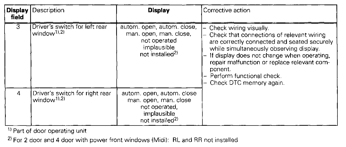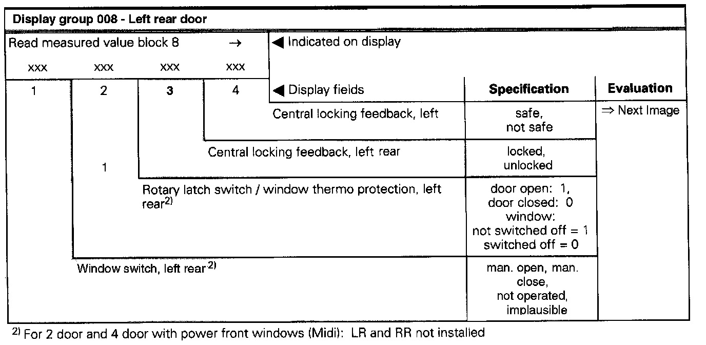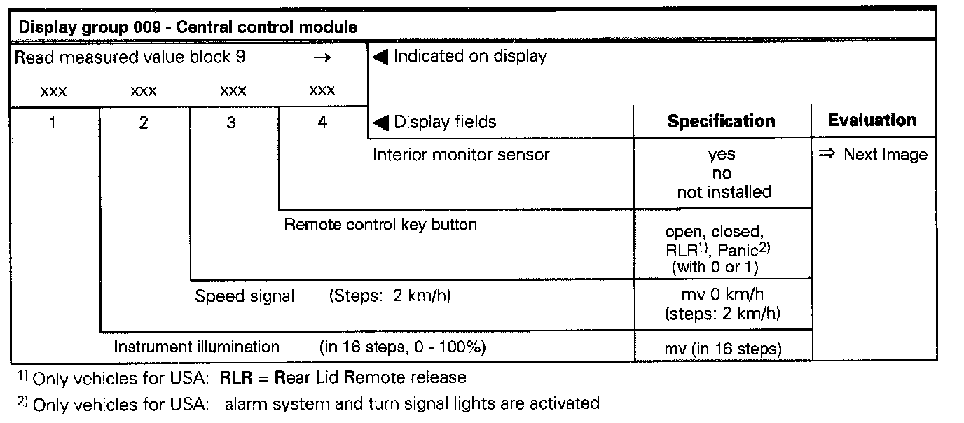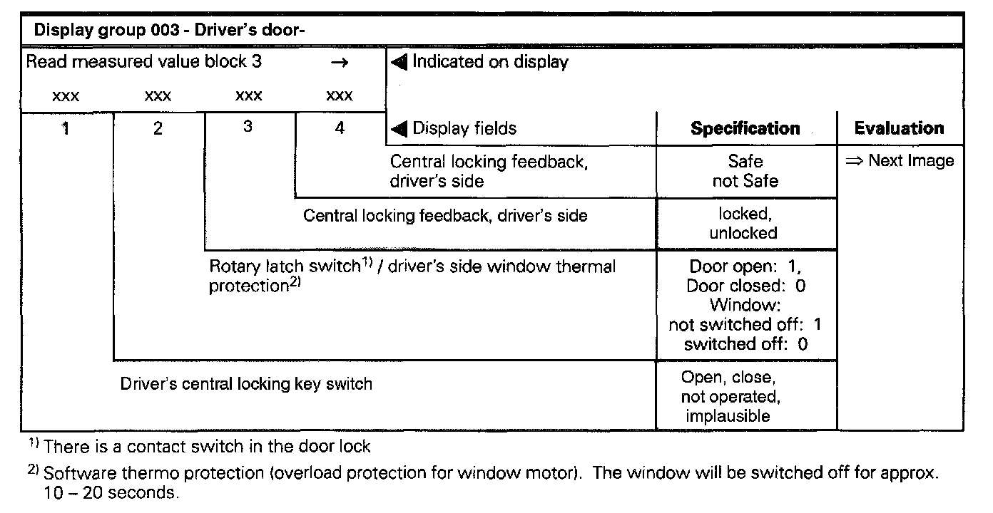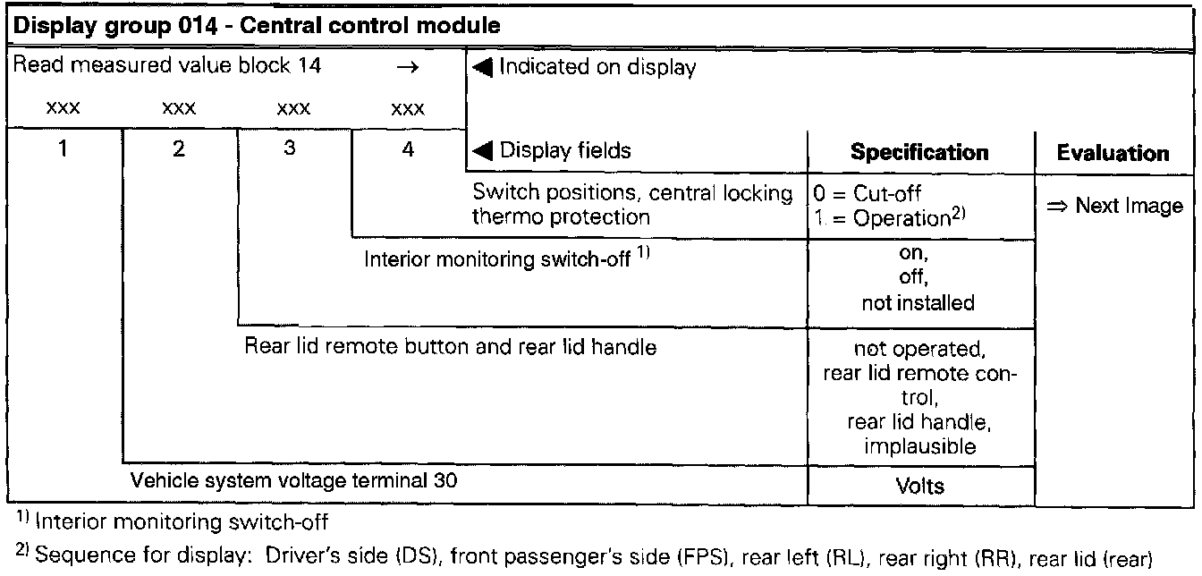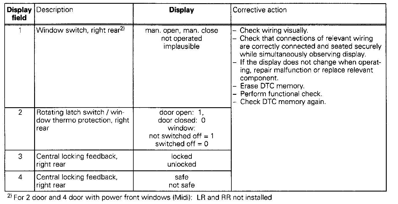 The measured values in "measured value block" and "basic setting" are described during the individual component test. This table serves only as an overview.