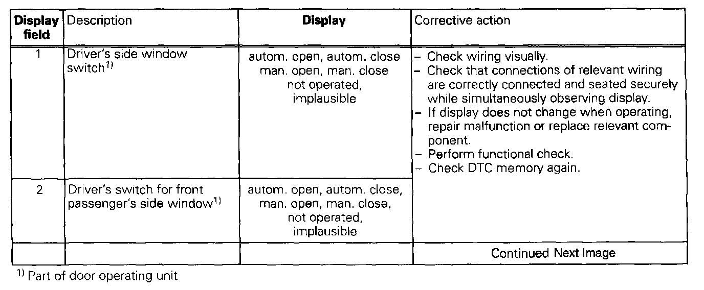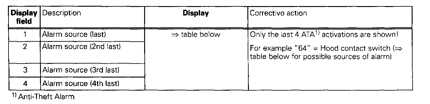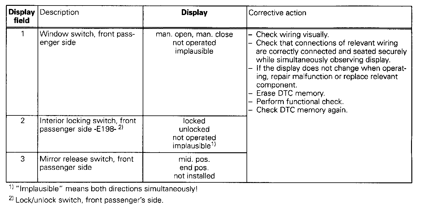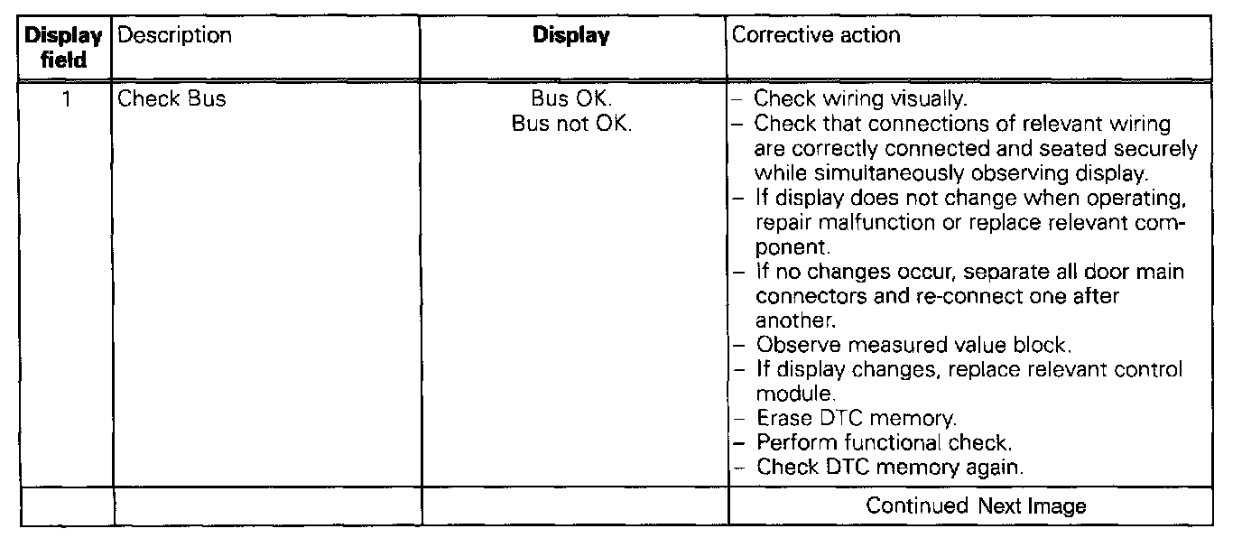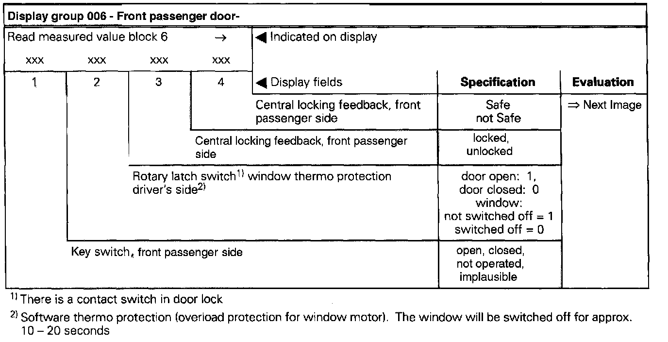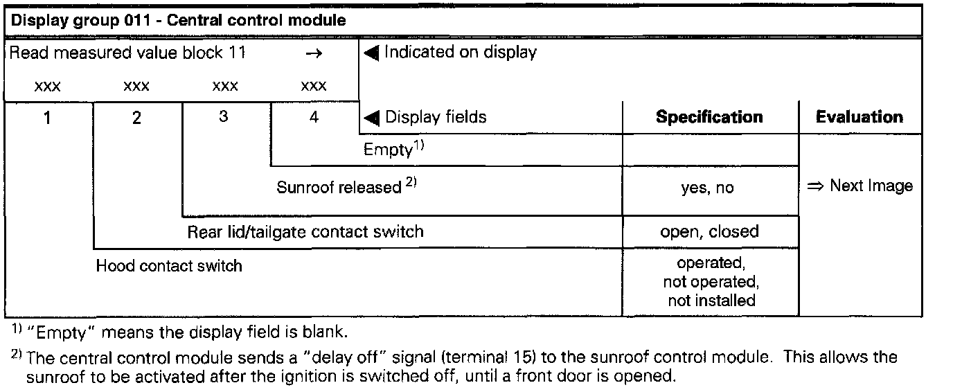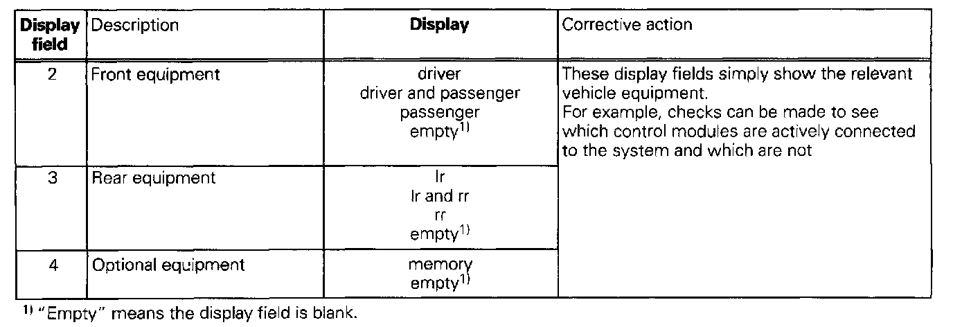 The measured values in "measured value block" and "basic setting" are described during the individual component test. This table serves only as an overview.