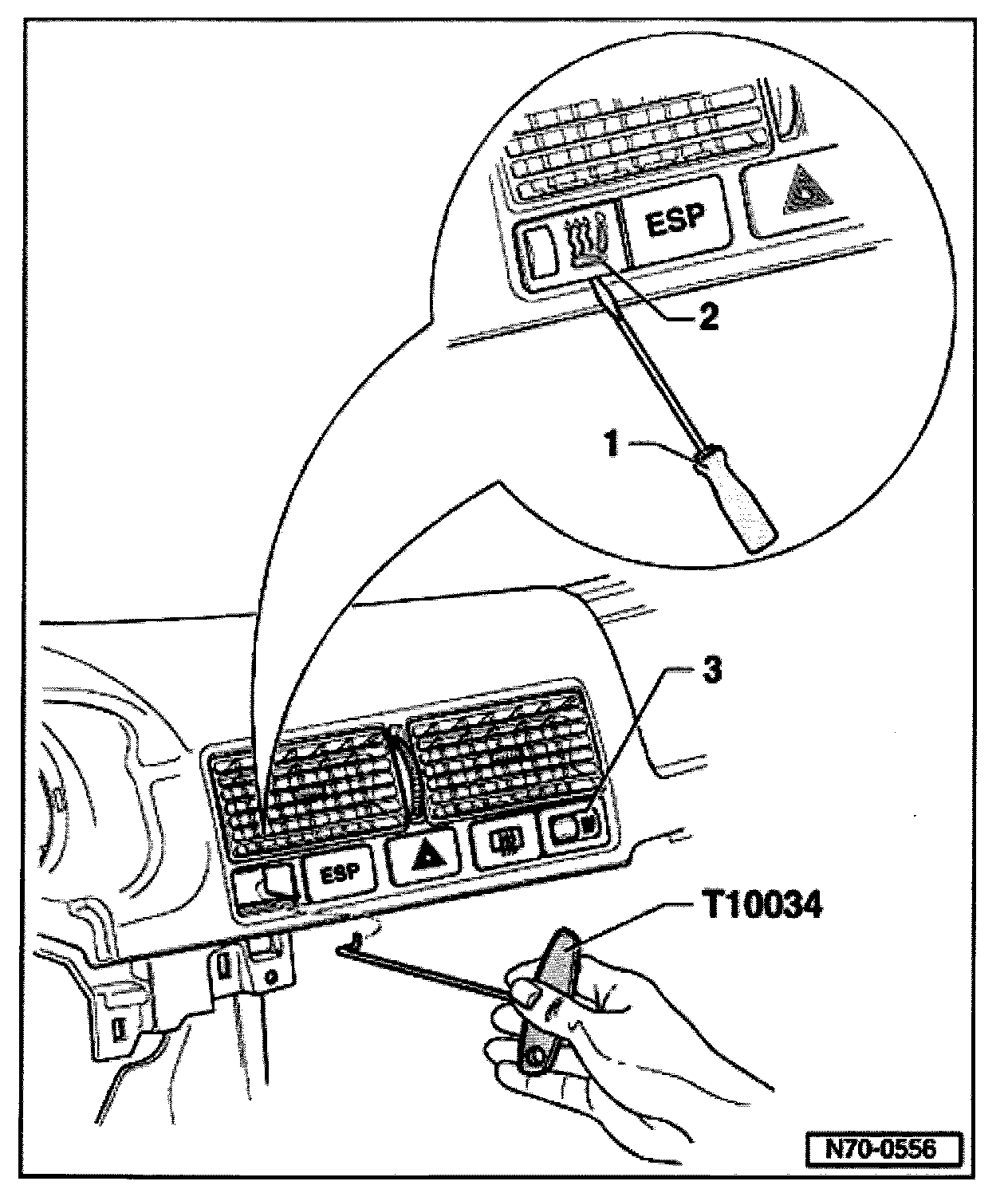 - Carefully release switch -2- (or switch -3- ) using a knife tip or a flat screwdriver -1- and remove.