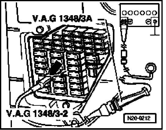 - Connect VAG1348/3A remote control to Fuel Pump (FP) and B+ at terminal 28a using VAG1348/3-2 remote control connection.