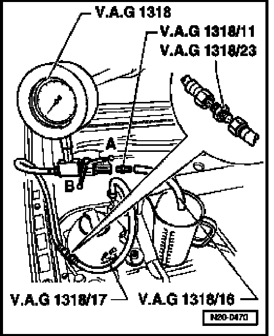- Connect pressure gauge (VAG1318) with adapter (1318/17) to hose.