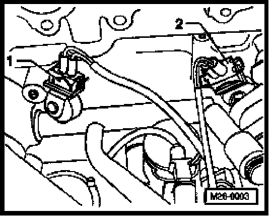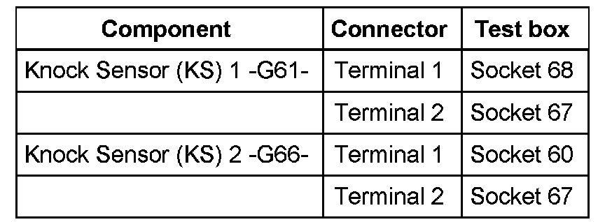 - Measure resistance between terminals 1 + 2 at connectors to knock sensors. Specified value: Infinite Ohms