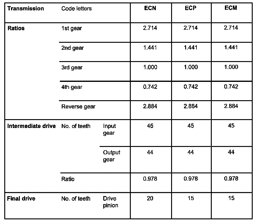 Code letters, transmission allocation, ratios, equipment (ECN, ECP, ECM Transmissions)