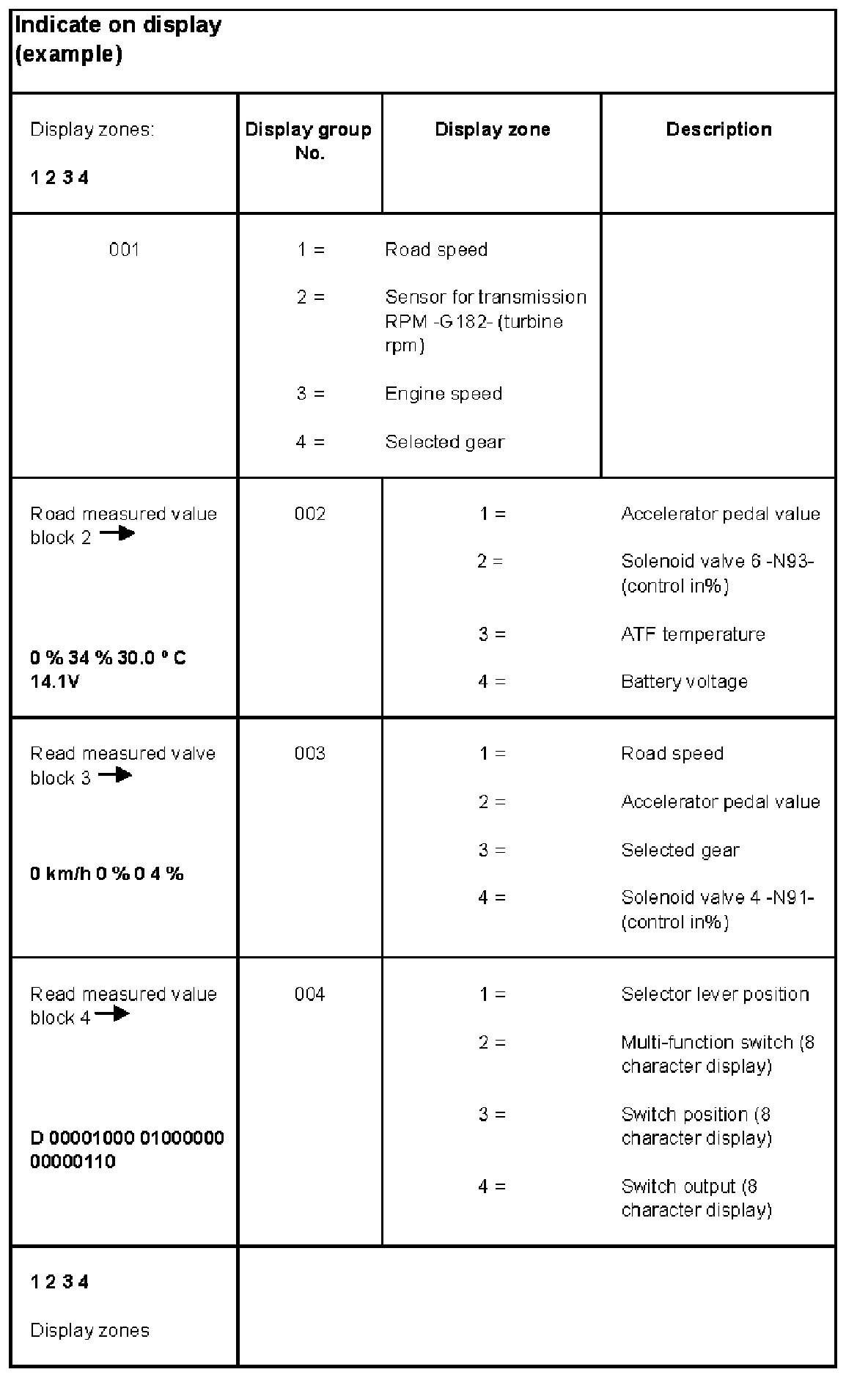 - There are always 4 display zones in the measured value block. Decoding the individual values in display zones 1 to 4 Evaluating Measured Value Blocks