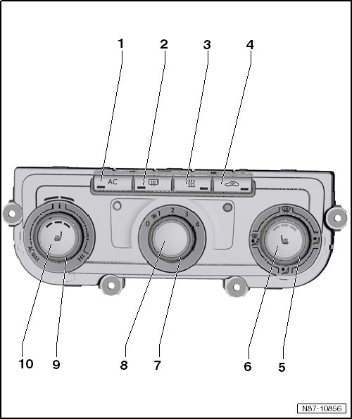 • If the lamp in the AC button does not come after the button is pushed, there may be a fault in the control module. Call up the DTC memory with the Vehicle Diagnostic Tester. If the fault entry "A/C compressor first start not performed" is present, then is it necessary to perform a basic setting and an adaptation "A/C compressor first start" either in Guided Fault Finding or in Guided Functions.