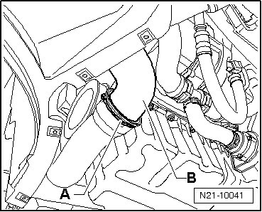 - Release the clamp - A - and disconnect the hose - B - from the charge air pipe.