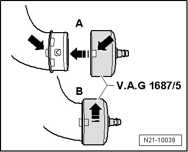 - Install the adapter (V.A.G 1687/5) onto the charge air pipe - A - and turn it approximately 90° - B -.