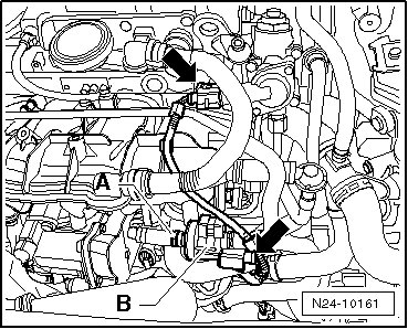 - Disconnect the connectors - arrows - from the EVAP canister purge regulator valve 1 (N80) and the low fuel pressure sensor (G410).