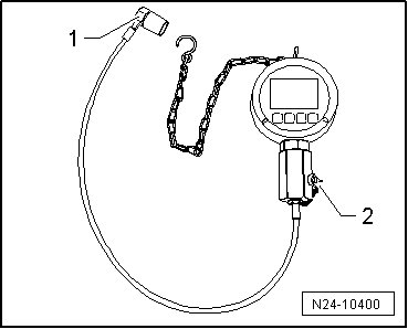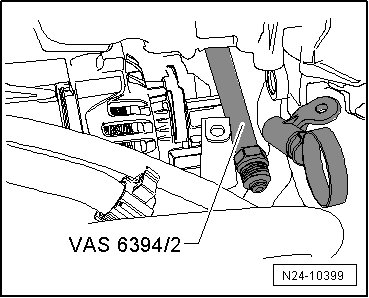 - Coat the adapter (VAS 6294/2) sealing point with clean engine oil and install it in the fuel rail. Tightening specification: 22 Nm.