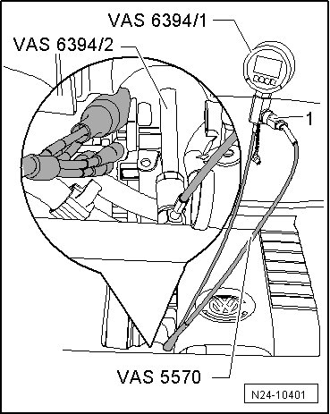 • If the pressure sensor tester (VAS 6394/1) does not display 0 bar, set it back to zero. Refer to the operating instructions.