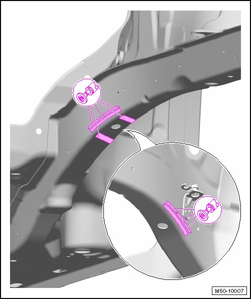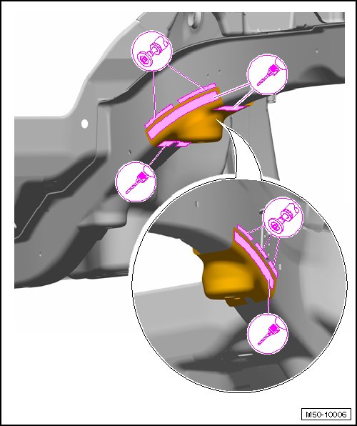 • On this vehicle for example, replacement of the subframe retaining bracket is described for the front left retaining bracket. Work procedure must be transferred to the other 3 retaining brackets accordingly as necessary.