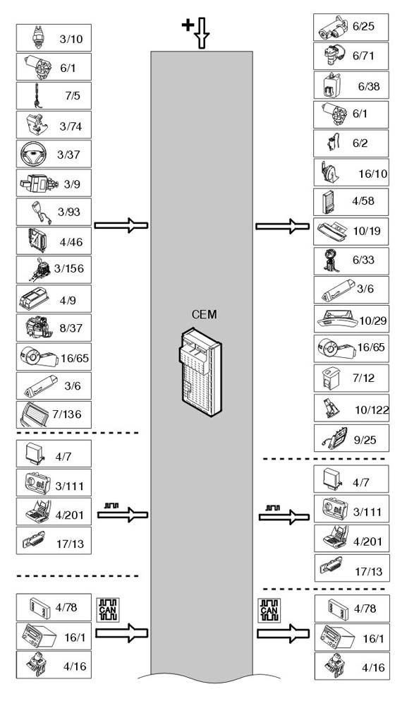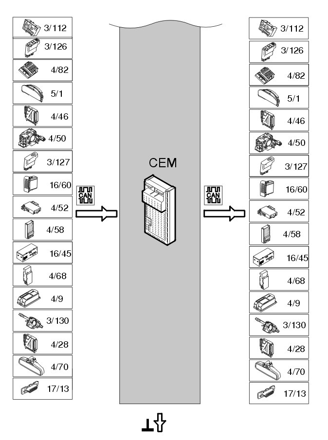 The central electronic module (CEM) controls the Controller area network (CAN) and acts as a bridge between the high and low speed networks and the data link connector (DLC). It also manages the following functions: