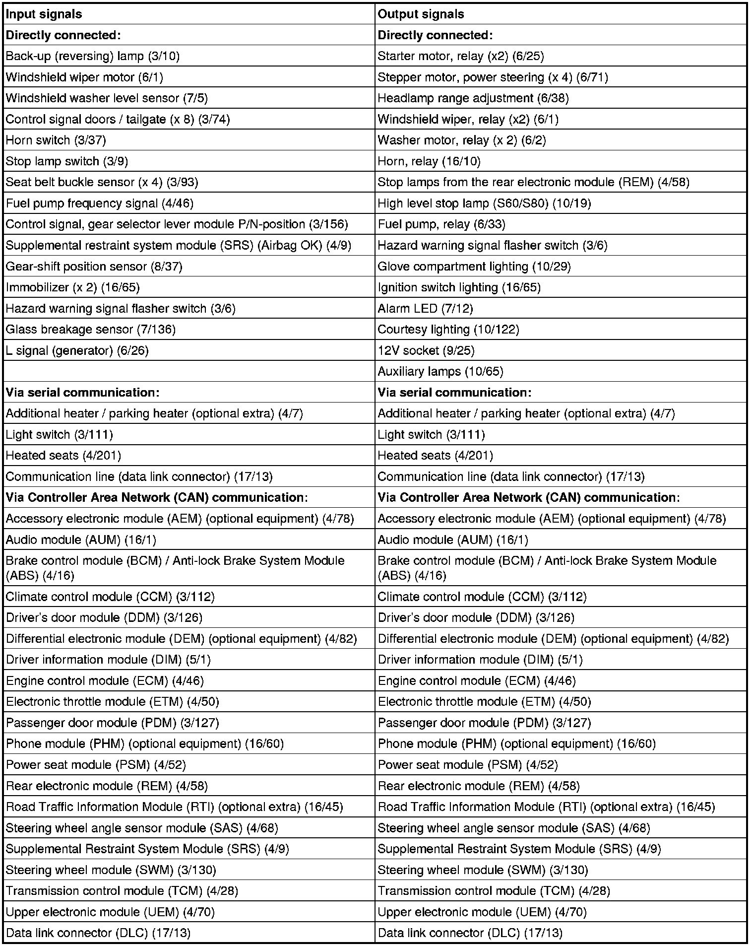 The following table summarizes the input signals to and the output signals from the central electronic module (CEM). The signal types are divided into directly connected signals, serial communication and Controller area network (CAN) communication. The following illustration displays the same information with the Volvo component designations.