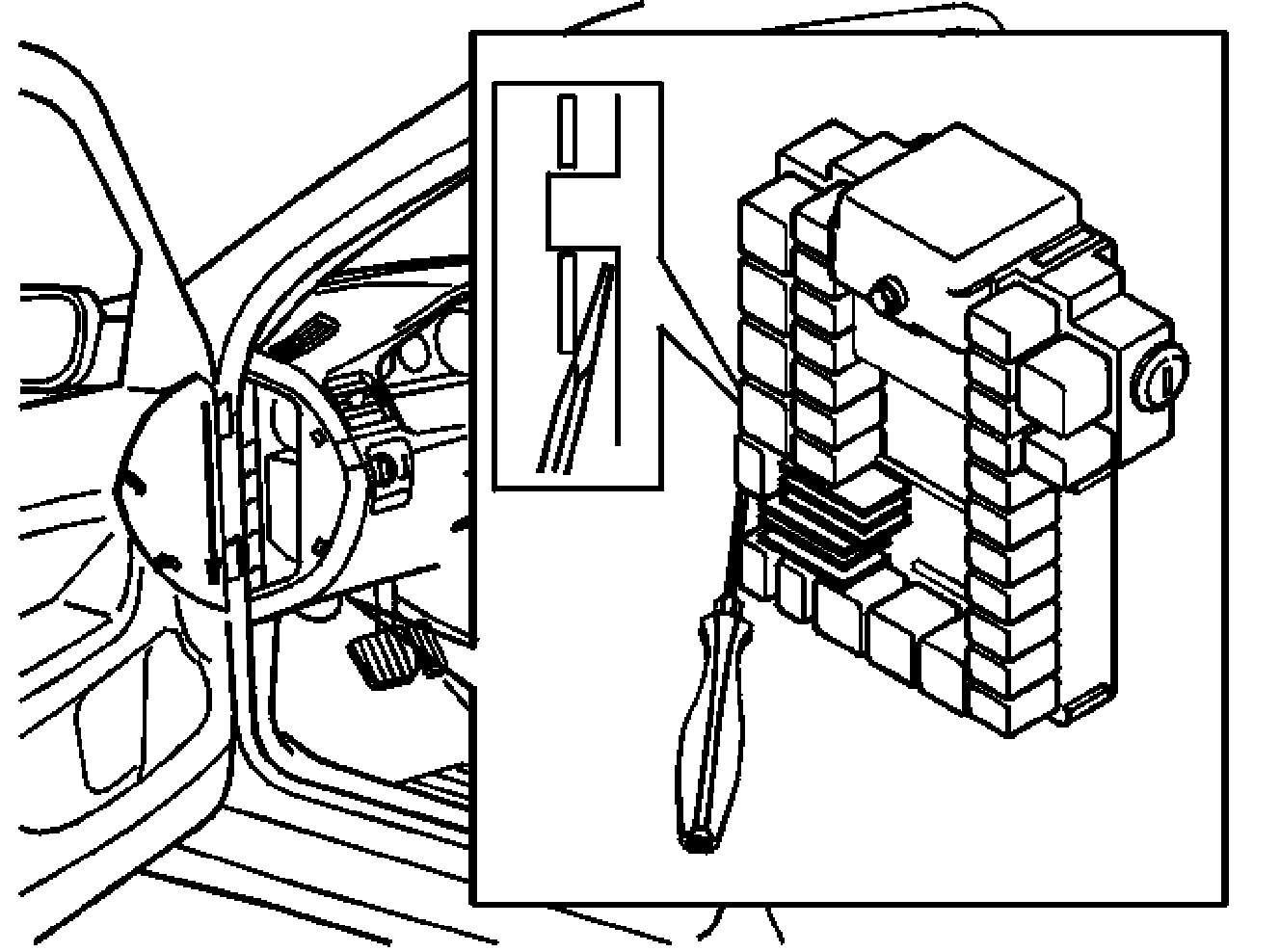 - Insert a screwdriver between the bracket and the relay box. Turn the screwdriver so that the bracket opens out. At the same time, pull the relay box out of the bracket towards the underside of the dashboard
