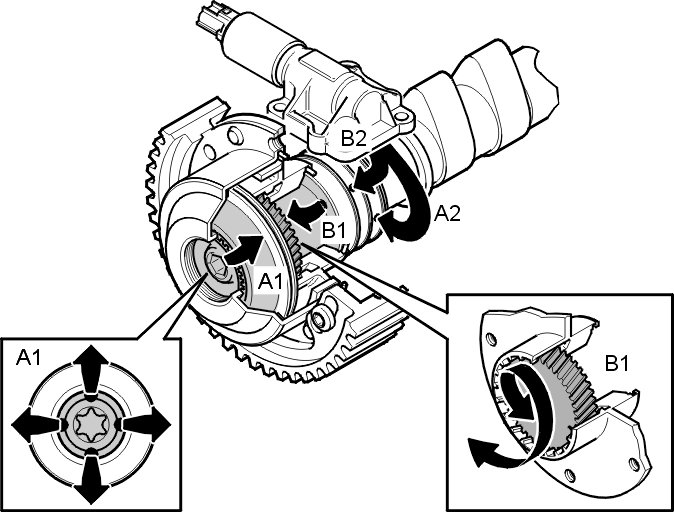 2. The engine control module (ECM) grounds the valve, the position of the piston in the valve changes and the oil is guided to the continuous variable valve timing (CVVT) unit chamber (A1) via the duct (A2) in the camshaft