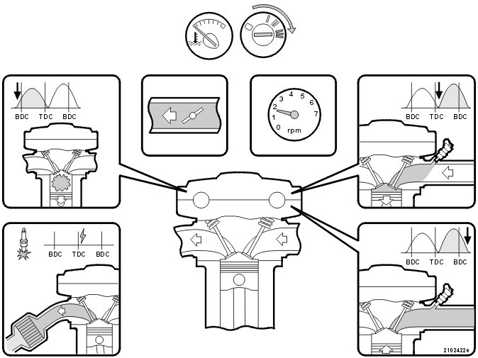 - during cold starting and during the warm-up phaseswhen the intake camshaft and exhaust camshaft are set late. This reduces the emissions