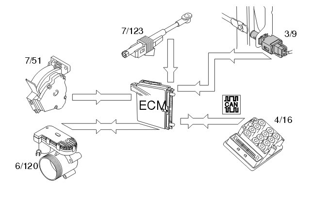 To ensure that the correct throttle angle is reached, the engine control module (ECM) controls the throttle shutter in the throttle unit (6/120), mainly using the signal from: