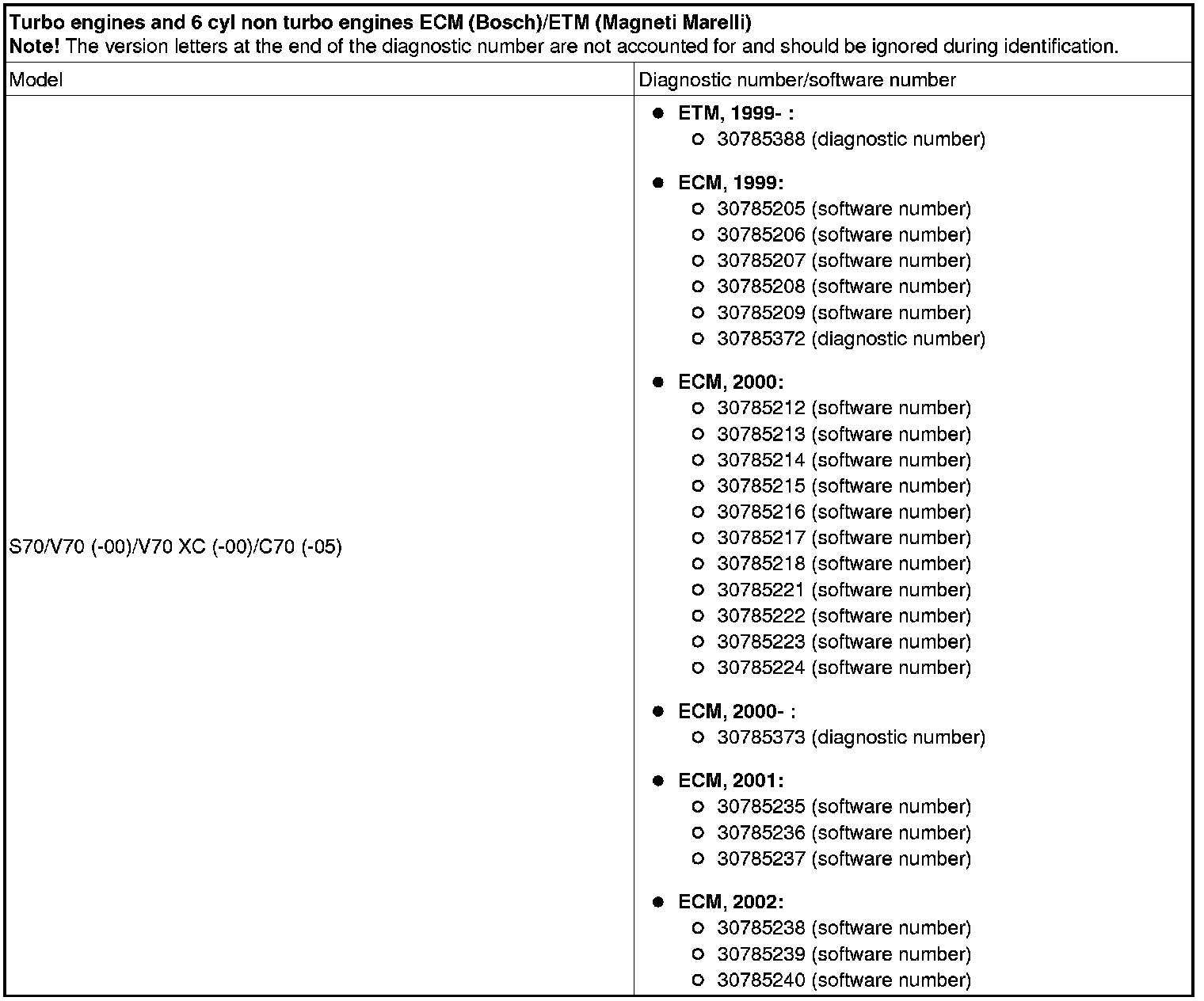 - Turbo engines and 6-cylinder non-turbo engines, (all markets except the USA/Canada market): Engine control module (ECM) software number 30785372 - 30785378 and electronic throttle module (ETM) diagnostic number 30785388.