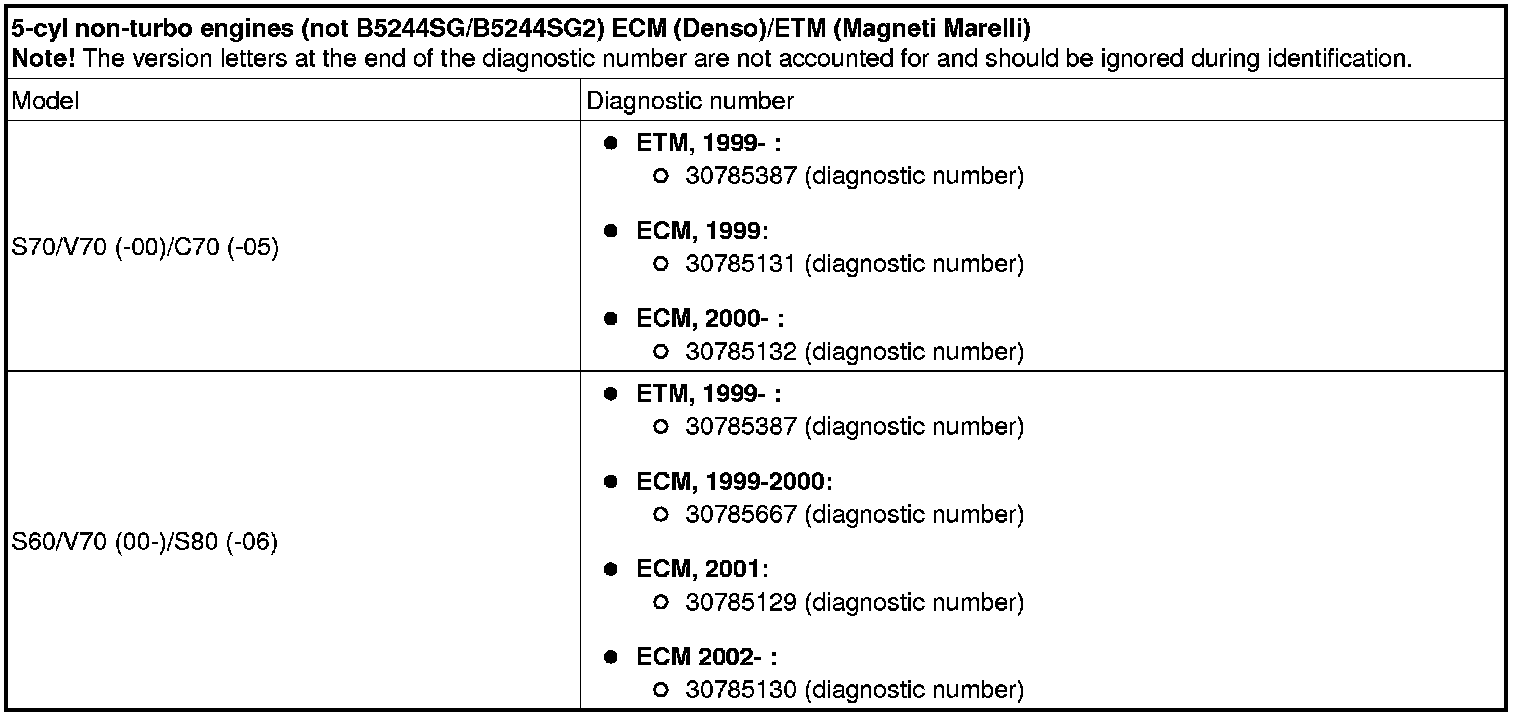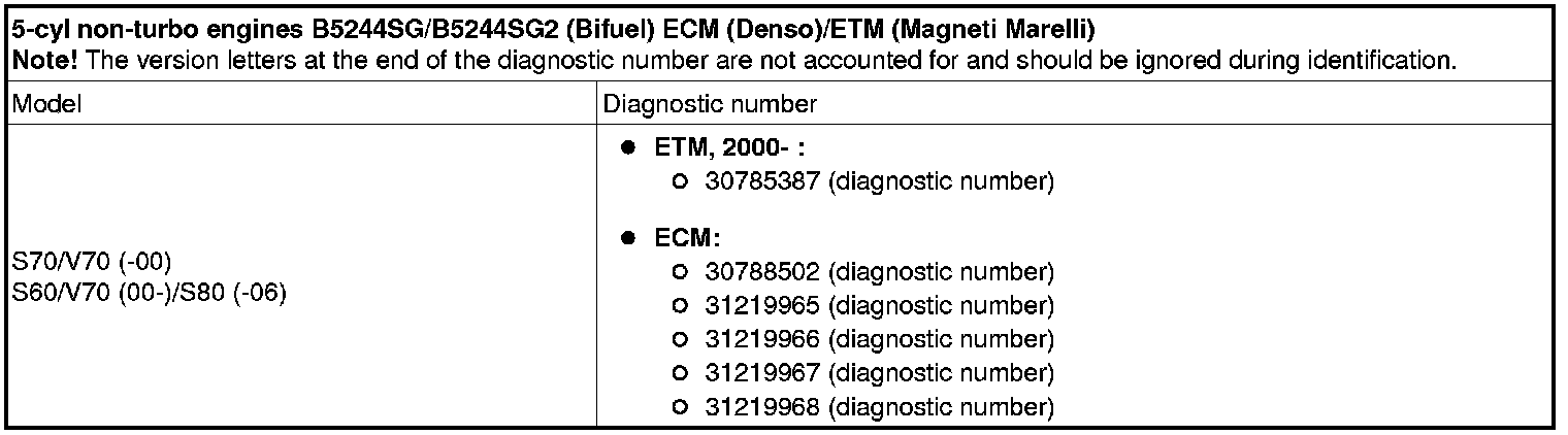 - 5-cyl non-turbo engines B5244SG/B5244SG2 (Bifuel), (all markets excluding USA/Canada): Engine control module (ECM) diagnostic number 31219965 - 31219968 or 30788502 and Electronic throttle module (ETM) diagnostic number 30785387.