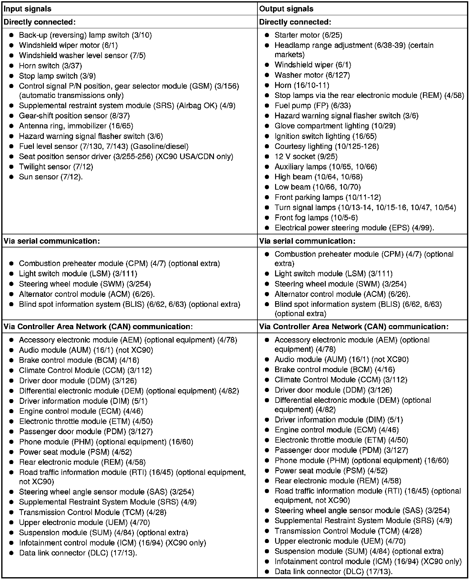 The table below summarizes the input signals to and output signals from the central electronic module (CEM). The signal types are divided into directly connected signals, serial communication and controller area network (CAN) communication. The illustration below displays the same information with the Volvo component designations.