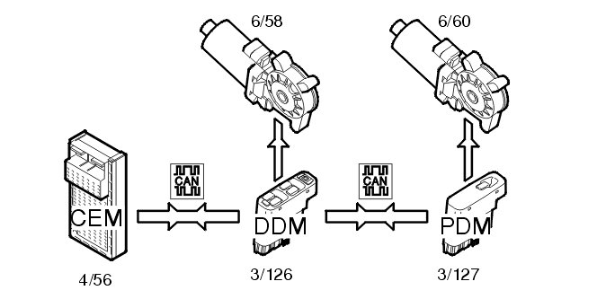 Window control is activated via switches on the driver door module (DDM) (3/126) and passenger door module (PDM) (3/127). The motor for the power window on the driver's side (6/58) is controlled directly from the driver door module (DDM). The motor for the power window on the passenger side (6/60) is controlled via CAN communication from the driver door module (DDM) to the passenger door module (PDM). The signals for operating the rear windows are transmitted from the driver door module (DDM) via the controller area network (CAN) to the central electronic module (CEM) (4/56), which manages the rear window functions.