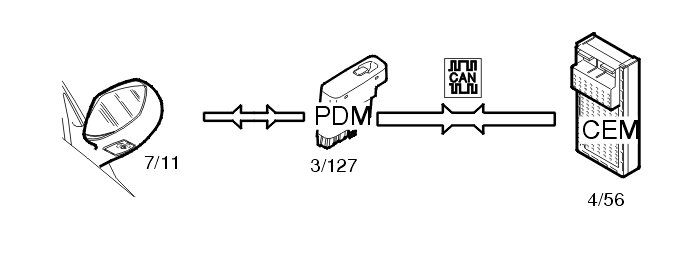 The guide lighting is activated using the left-hand control stalk (the key must be removed from the ignition switch). The steering wheel module (SWM) (3/130) then transmits a signal via the controller area network (CAN) to the central electronic module (CEM) (4/56). When the car is then locked, the central electronic module (CEM) sends a signal onwards via the controller area network to the driver door module (DDM) (3/126) and passenger door module (PDM) (3/127), which turn on the lights in the door mirrors (10/148 and 10/149). The lights are part of the guide lighting function and remain on for a set time (30, 60 or 90 seconds).