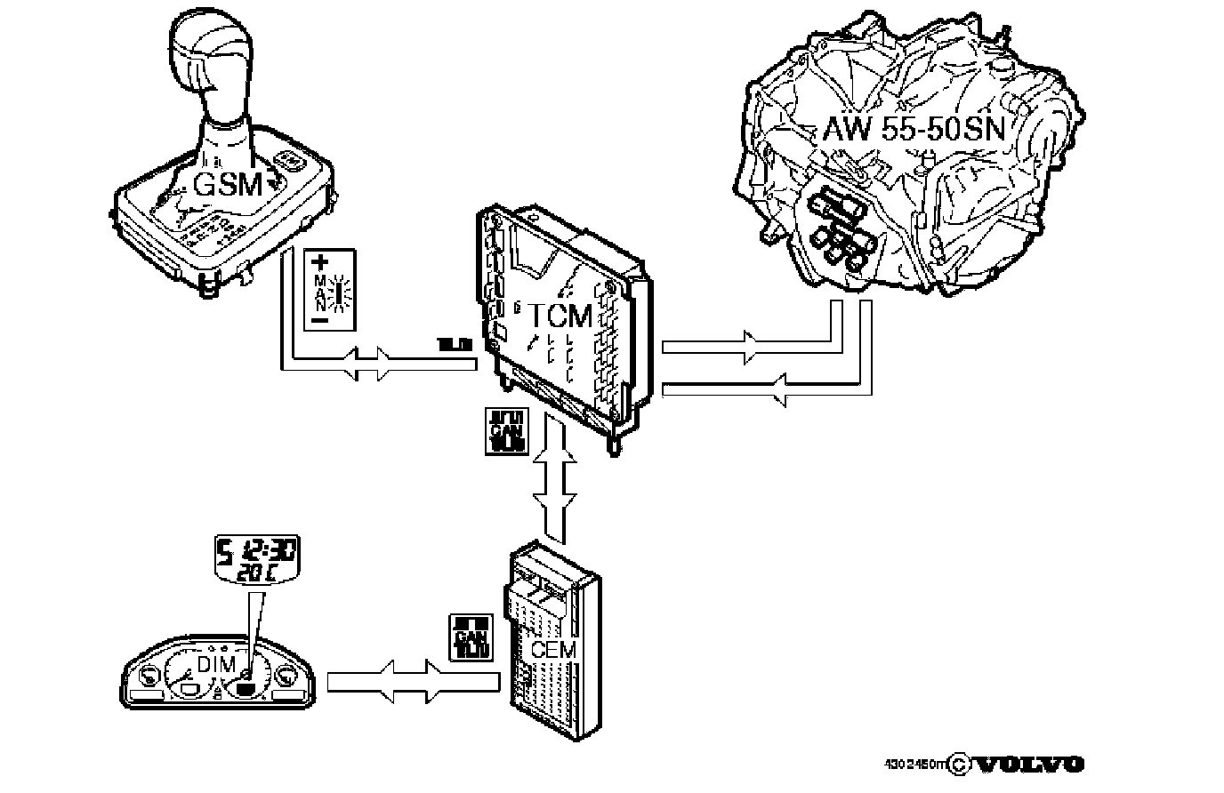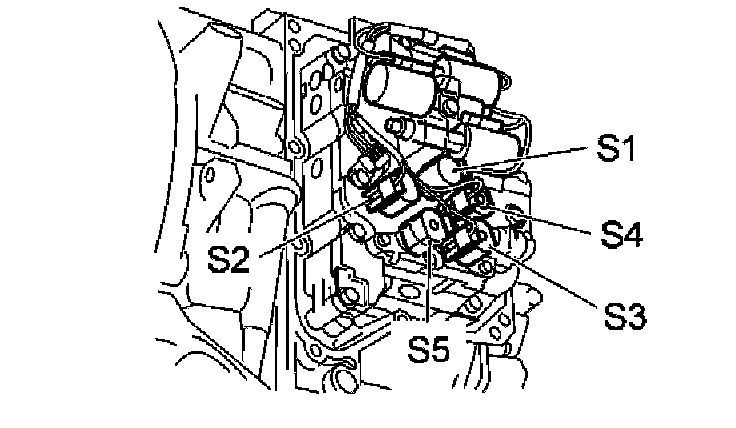 The shift solenoids S1, S2, S3, S4 and S5 are positioned in the valve body in the transmission control system, which is mounted on the front edge of the transmission. The shift solenoids (on/off type), consist of an electrical coil which controls a hydraulic valve. The solenoids are supplied with 12 V via the Transmission Control Module (TCM) and grounded in the control system. The shift solenoids control shifting and the Transmission Control Module (TCM) determines which gear is to be used by activating them in different patterns.