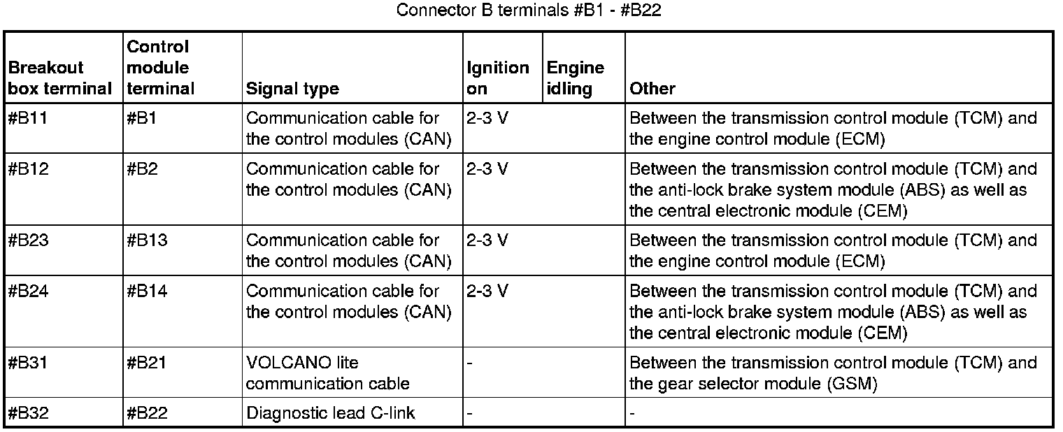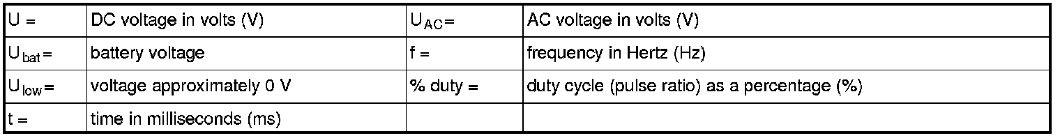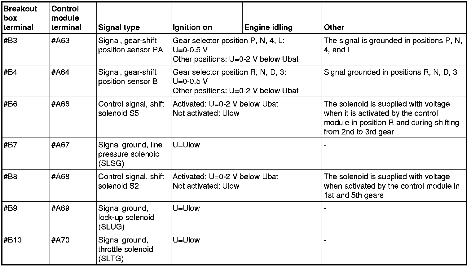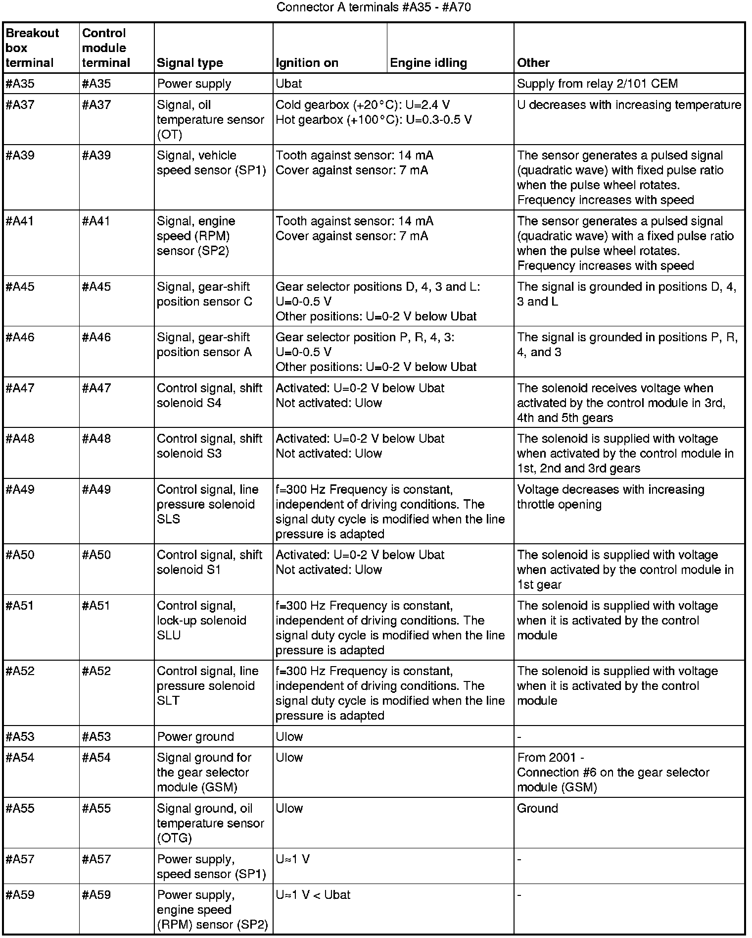 All the values listed below are between the terminal in column 1 and terminal #A53 (signal ground), unless otherwise indicated in brackets.