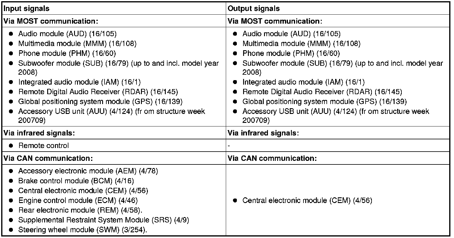 The table below summarizes the input signals to and output signals from the Infotainment control module (ICM). The signal types are divided into infra-red signals (IR), MOST communication and controller area network (CAN) communication. The illustration below displays the same information with the Volvo component designations.