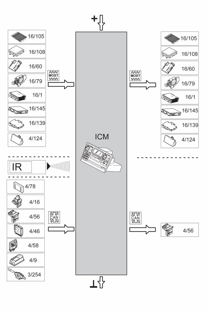 The infotainment control module (ICM) acts as a gateway between the CAN and MOST network. It also acts as the master control module in the MOST network and checks the other control modules.